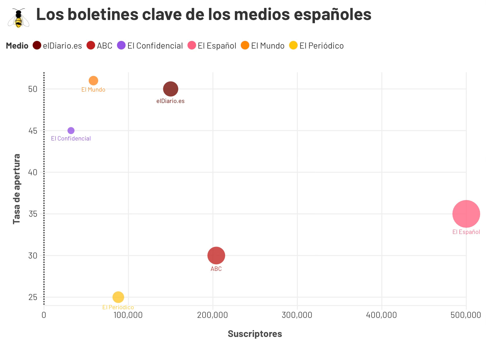 Mientras dormías (diaria, gratuita), El Español - 500.000 suscriptores y 35% tasa de apertura. Comentan que les gustaría situarlo en un 45%, la cifra que manejaban cuando la base de lectores era más pequeña