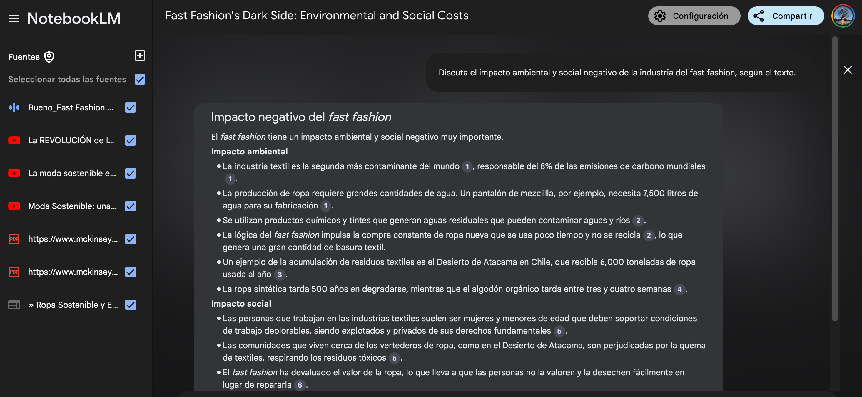 Mi favorita fue Notebook LM. Básicamente, es “una libreta inteligente pensada para tareas creativas” y gratis (no sé bien hasta cuándo). Puede ayudarte con el brainstorming para un tema, a transcribir y sacar las claves más importantes de una entrevista, destacar datos relevantes de las fuentes que le proporciones o resumir información. Y todo ello citando las fuentes que tú le das.