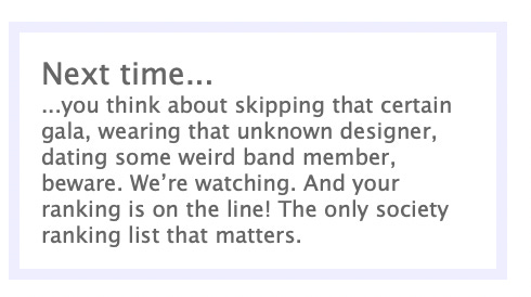El 24 de abril de 2006 debió ser un día complicado para la flor y nata de Manhattan. Puedo imaginar a cualquier microcelebridad neoyorquina con la mandíbula desencajada y el corazón desbocado al ver en pantalla el titular “Las 20 mujeres más importantes de Manhattan”. Alguna se debió buscar desesperadamente en el listado; primero en una lectura en diagonal y más adelante deslizando lentamente, nombre por nombre, para asegurarse de que no se había dejado ningún píxel sin recorrer. Las socialités, acostumbradas a la validación de revistas, periódicos o premios, buscaban ahora la aprobación de Socialite Rank, un blog salido de la nada con un tono a caballo entre Gossip Girl y Mean Girls.