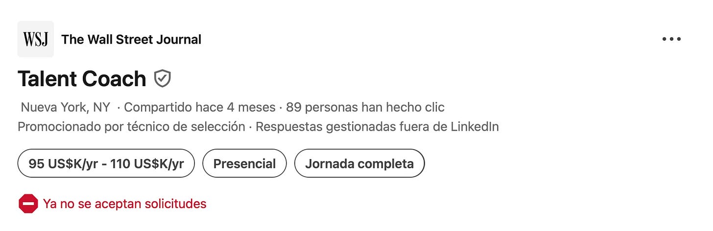 El Wall Street Journal ha contratado un coach de talento. Honestamente, yo tampoco entendía qué tipo de funciones desarrollaba un perfil de este tipo hasta que leí la descripción del puesto en LinkedIn: “establecer objetivos en las redes sociales” y “desarrollar guías, plantillas y otros recursos prácticos para apoyar el desarrollo continuo de los periodistas en las redes sociales”. Por todo ello, el beneficiario se embolsaría unos 95.000 dólares. Emily Sundberg ha entendido a la perfección lo que el WSJ busca realmente: un profesional que convierta a sus periodistas en influencers en las redes sociales. ¿No es eso, acaso, aquello a lo que deberían aspirar todos los medios? Que sus periodistas tengan una identidad reconocible, ya sea poniéndose frente a un micrófono o con una prosa única. Por lo pronto, me ENCANTARÍA colarme en la rutina del coach de talento del Wall Street Journal y saber cómo se desarrolla su día entre las 9 y las 5.