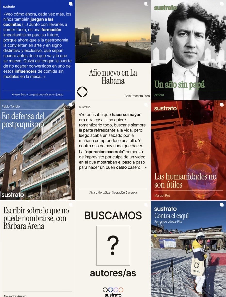 Desde entonces, ese “proyecto innovador” se ha colado en mi feed de Instagram y en las stories de las personas a las que sigo. Son extractos de escritos virales firmados por chicas y chicos de mi generación. Sustrato les sirve de estructura donde publicar, el lugar donde germinan ideas y donde se crea, de a poco, una escena cultural poblada por la clase creativa; es decir, personas que se dedican a la creatividad y que están al tanto del último concierto, la última novedad editorial o la última película indie. Son también los herederos del hipsterismo: buscan codearse con nombres cuyo arroba conocen mejor que el tiempo de cocción de la pasta y escriben desde cafeterías de especialidad.